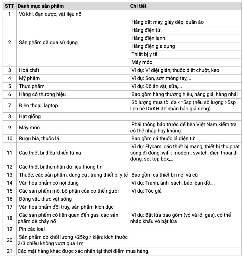 Đối với toàn bộ mặt hàng thuộc danh mục hàng hạn chế nhập Shippo sẽ có tư vấn trên từng đơn hàng cụ thể.