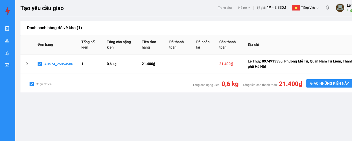 2.1. Thực hiện yêu cầu giao hàng qua hệ thống: