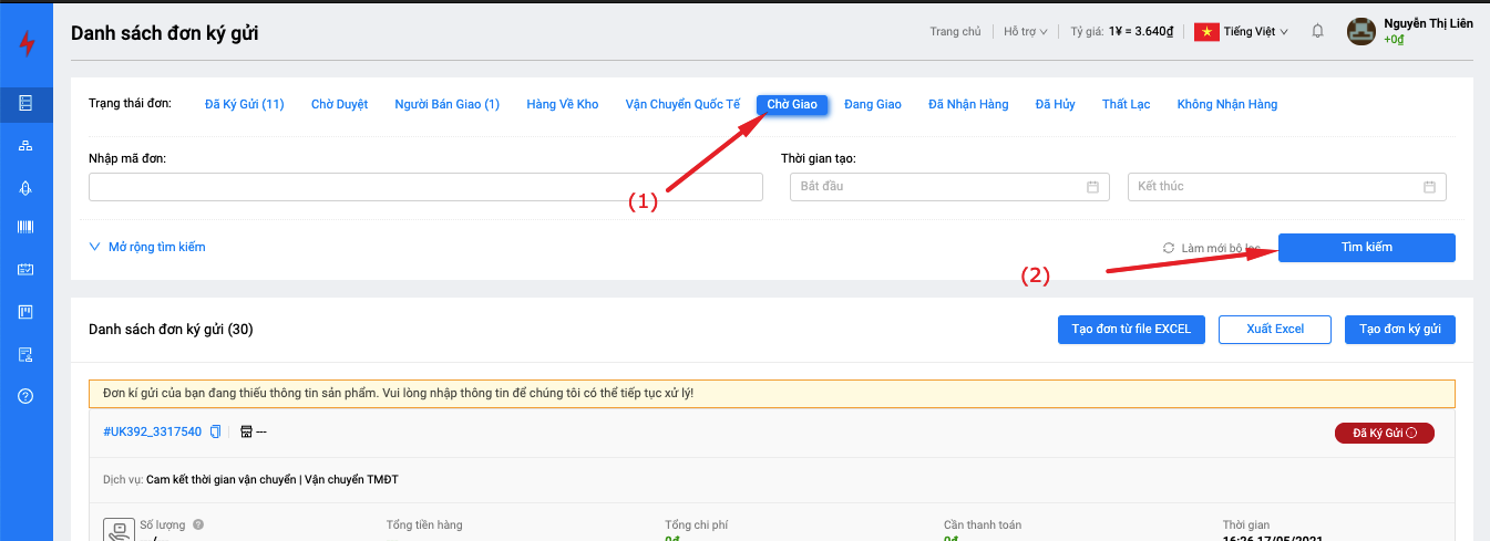 Để xem chi tiết danh sách các kiện hàng đã về kho Việt Nam Khách hàng chọn trạng thái đơn “Chờ giao” và bấm “Tìm kiếm” như hình: