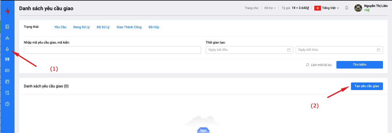 Bước 1: Đăng nhập tài khoản, chọn mục Giao hàng (1) => Chọn Tạo yêu cầu giao hàng (2) như hình: