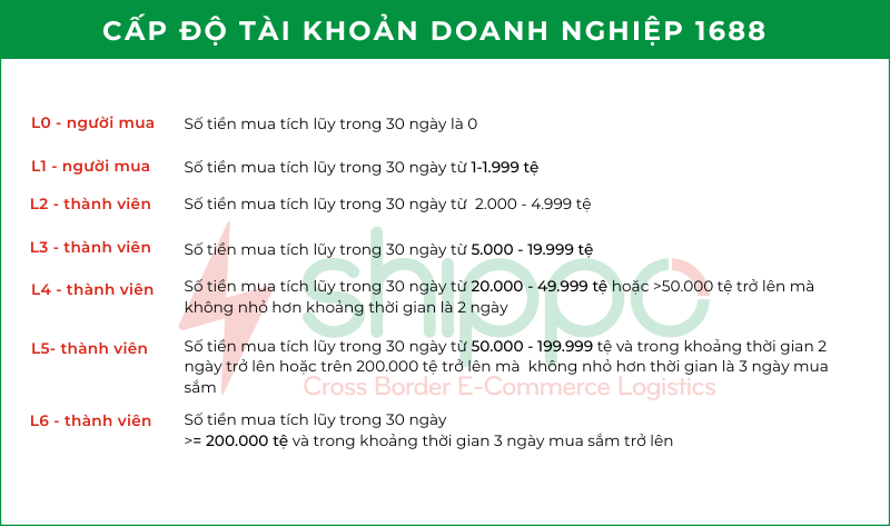 Đối với 1688, người ta chia thành 7 level từ Level 0 đến Level 6 theo các tiêu chí và điều kiện trở thành thành viên như sau: