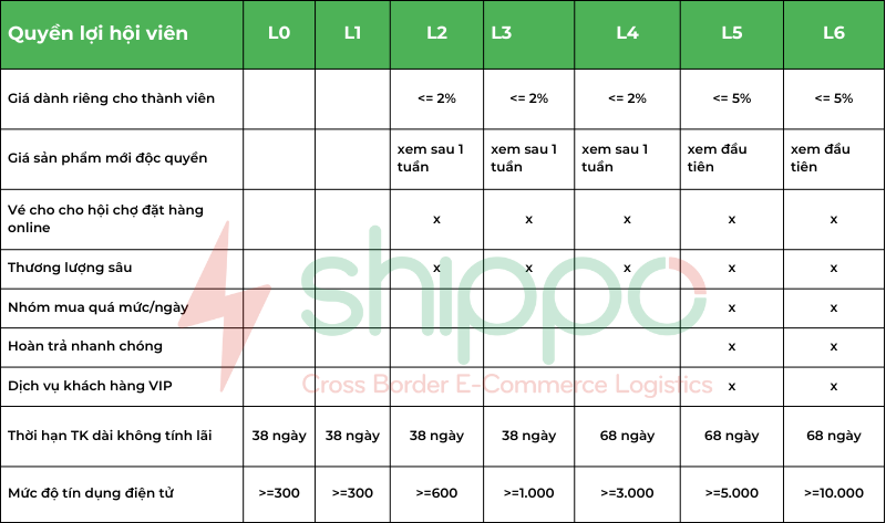 Quyền và lợi ích: tối thiểu 300 đối với người dùng L0-L1, 600 đối với L2, 1.000 đối với L3, 3.000 đối với L4, 5.000 đối với L5 và 10.000 đối với L6. Chỉ dành cho những người bán đã mở tín dụng điện tử chân thành