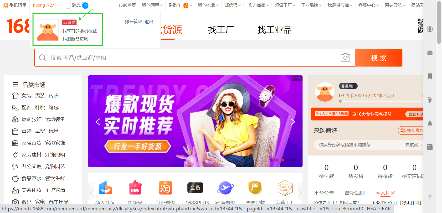 Các bạn hoàn toàn có thể xem và theo dõi cấp độ thành viên của mình bằng cách đăng nhập tài khoản trên 1688.com. Trong giao diện trang chủ, chú ý đến phần tài khoản của bạn ở góc trên bên trái màn hình: