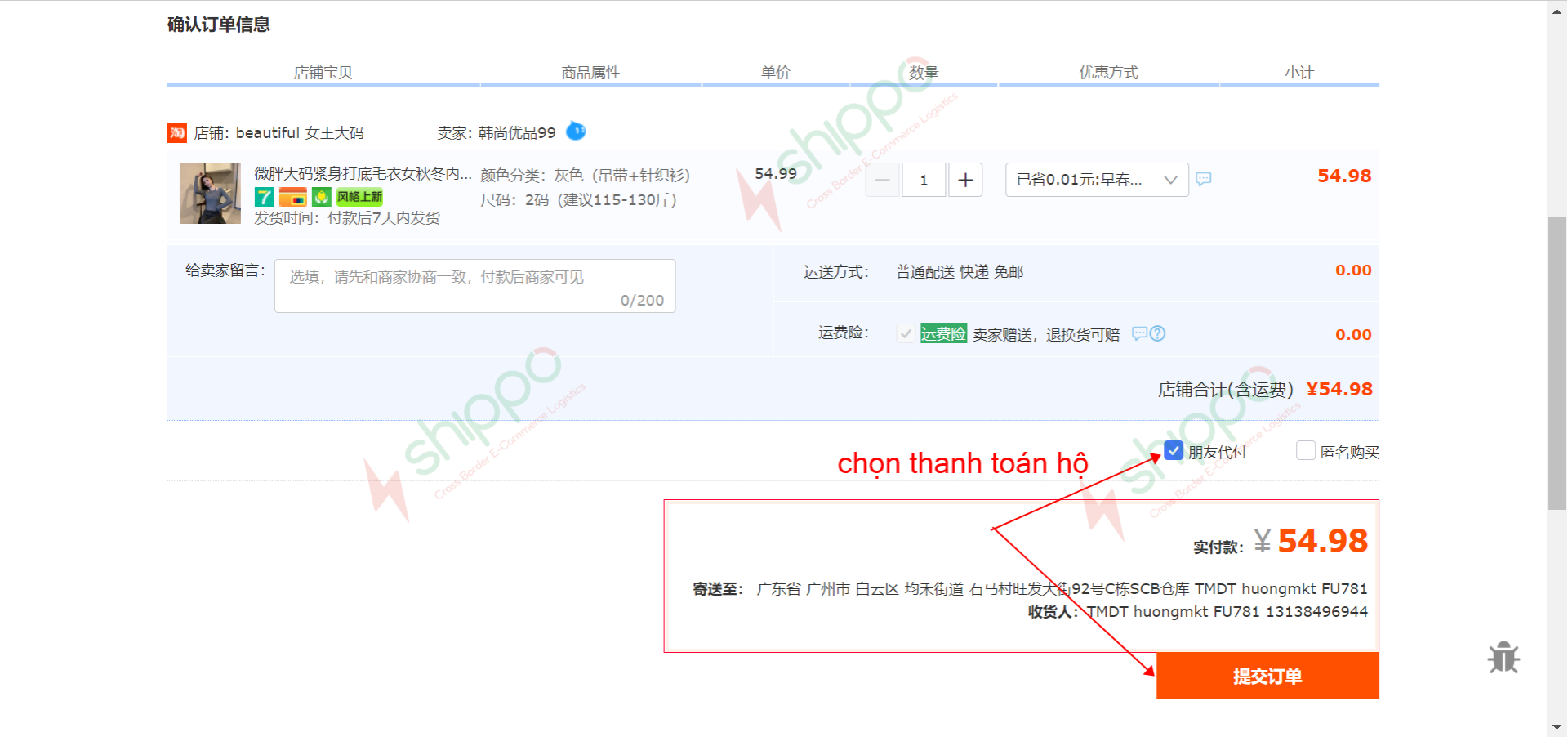 Bước 2: Tiếp đến, xác nhận các thông tin sản phẩm, địa chỉ giao hàng, bạn sẽ chọn phiên bản Trung Quốc đại lục và nhấp chọn tính năng nhờ người thanh toán hộ trên hệ thống.