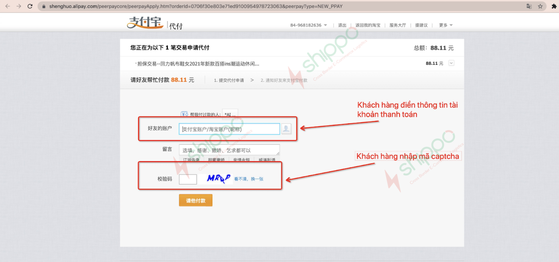 Bước 3: Trên giao diện thanh toán, người dùng nhập tài khoản Alipay của người thanh toán hộ, nội dung và tên người nhận thanh toán hộ. Tiếp đến, bạn sẽ nhập mã xác minh và bấm chọn nút màu cam để hoàn tất.