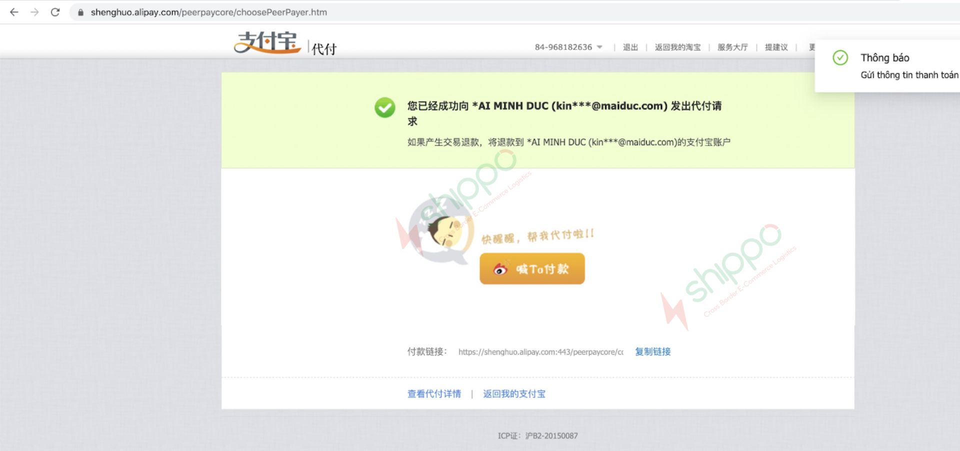 Ảnh xác nhận bạn đã gửi yêu cầu thanh toán hộ thành công đến tài khoản alipay nhờ thanh toán hộ.