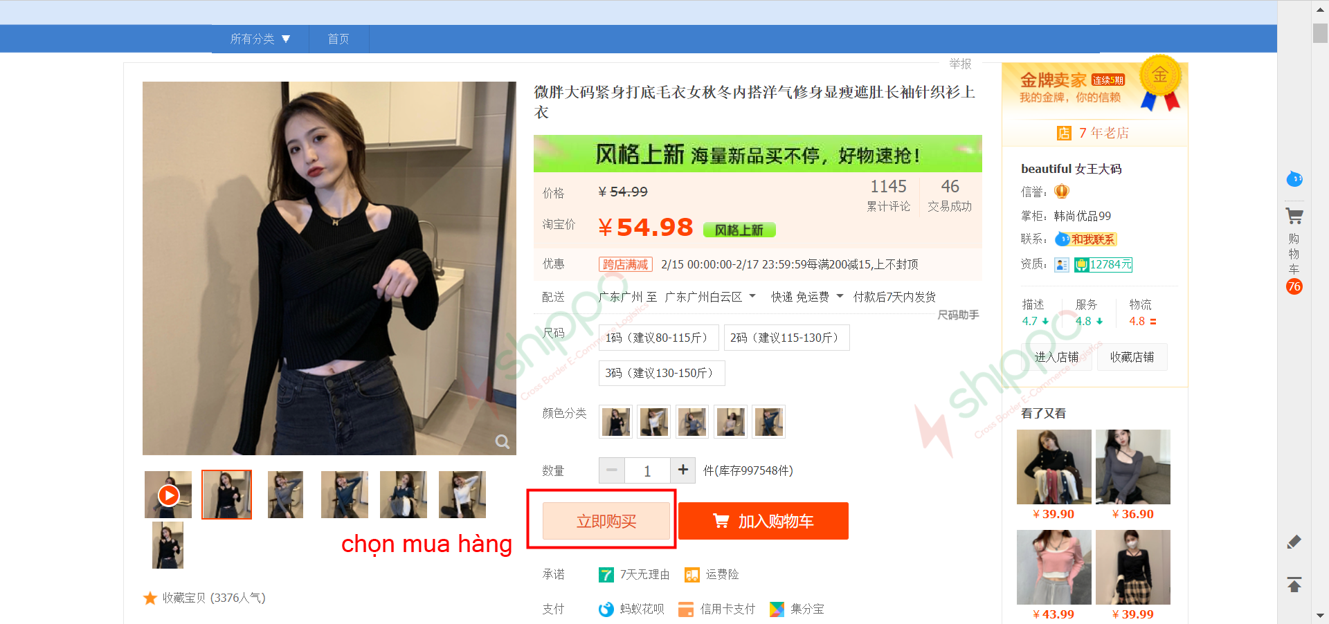 Bước 1: Trước hết, khi lựa chọn được sản phẩm ưng ý bạn bấm chọn mục "mua hàng".